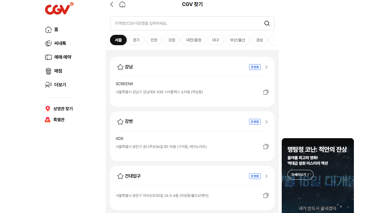 CGV 앱은 예매 속도도 빠르고 할인쿠폰도 받을 수 있어 매우 유용합니다.